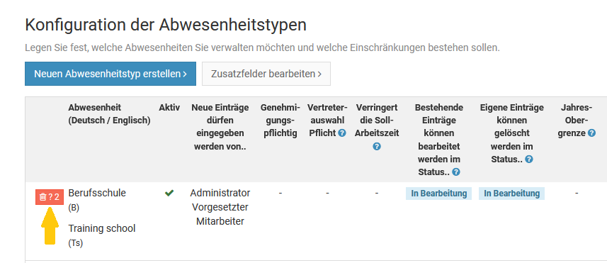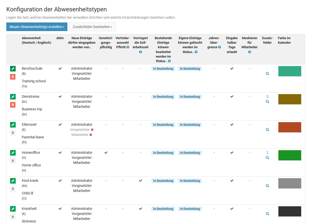 Ein Admin kann für jeden Abwesenheitstyp (Urlaub, Homeoffice, Dienstreise, ...) einstellen, ob dieser