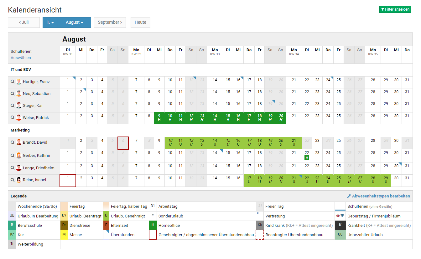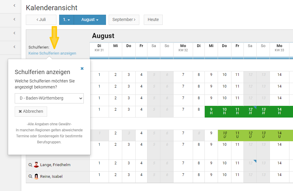 Alternativ kann der Vorgesetzte oder Admin die Kalenderansicht per Klick links oben auf "