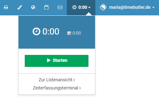 Auf jeder Seite besteht die Möglichkeit, die Seite auszudrucken. Um eine Seite auszudrucken, können Sie die Druckfunktion Ihres Browsers benutzen oder Sie klicken auf das Symbol mit dem Drucker oben auf allen Seiten im Timebutler.