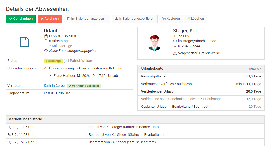 Wenn ein Mitarbeiter einen genehmigungspflichtigen Abwesenheitseintrag eingibt, dann startet Timebutler den Genehmigungsworkflow und benachrichtigt den / die Vorgesetzte(n). Die Genehmigung des Abwesenheitseintrages erfolgt genau wie bei der Genehmigung eines Urlaubsantrages. Lesen Sie hier, wie