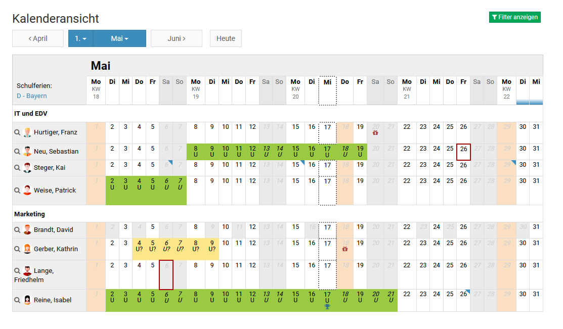 Alternativ kann der Vorgesetzte oder Admin die Kalenderansicht per Klick links oben auf "