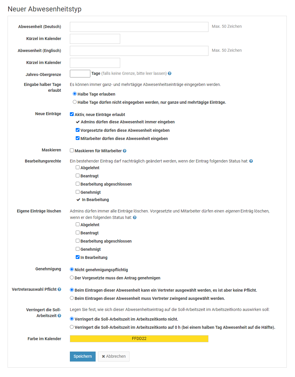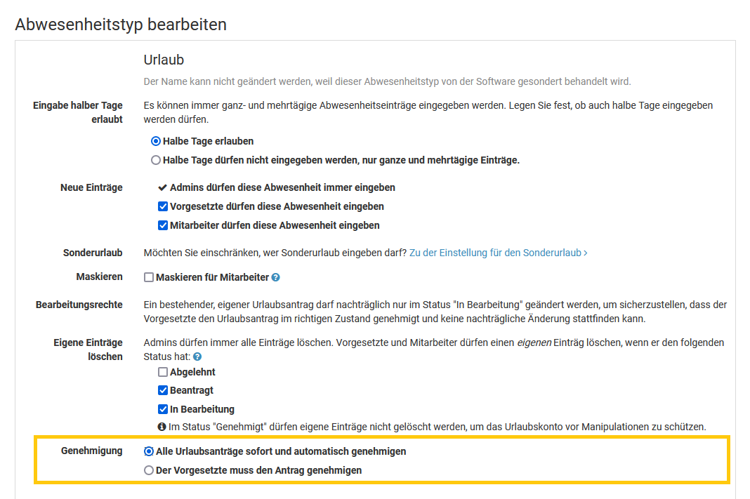 Ein Admin kann für jeden Abwesenheitstyp (Urlaub, Homeoffice, Dienstreise, ...) einstellen, ob dieser