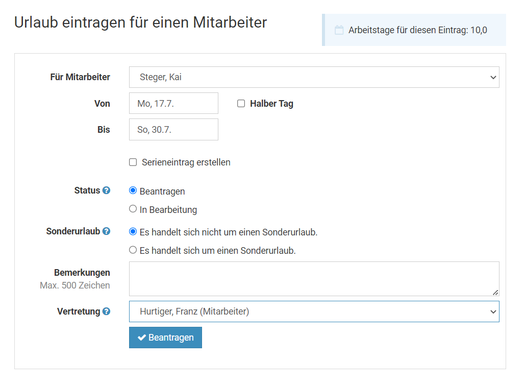 Screenshot: Abwesenheit über das Eingabeformular eingeben